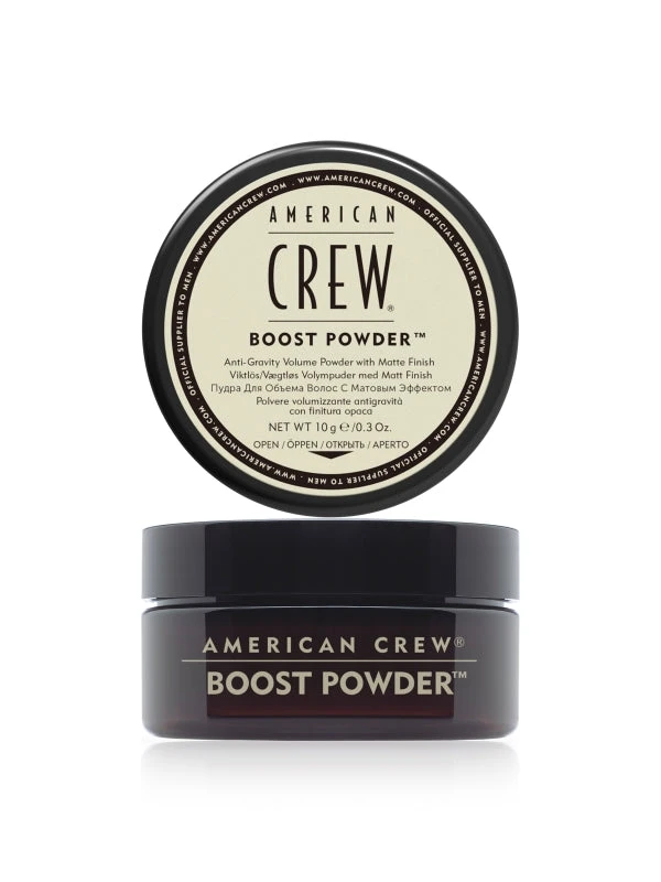 Anti-gravity volume powder with matte finish. Give hair lift, thickness and a matte finish with American Crew Boost Powder. This weightless powder adds grit for dramatic, gravity-defying texture. And, it can be layered with virtually any other American Crew styling product.