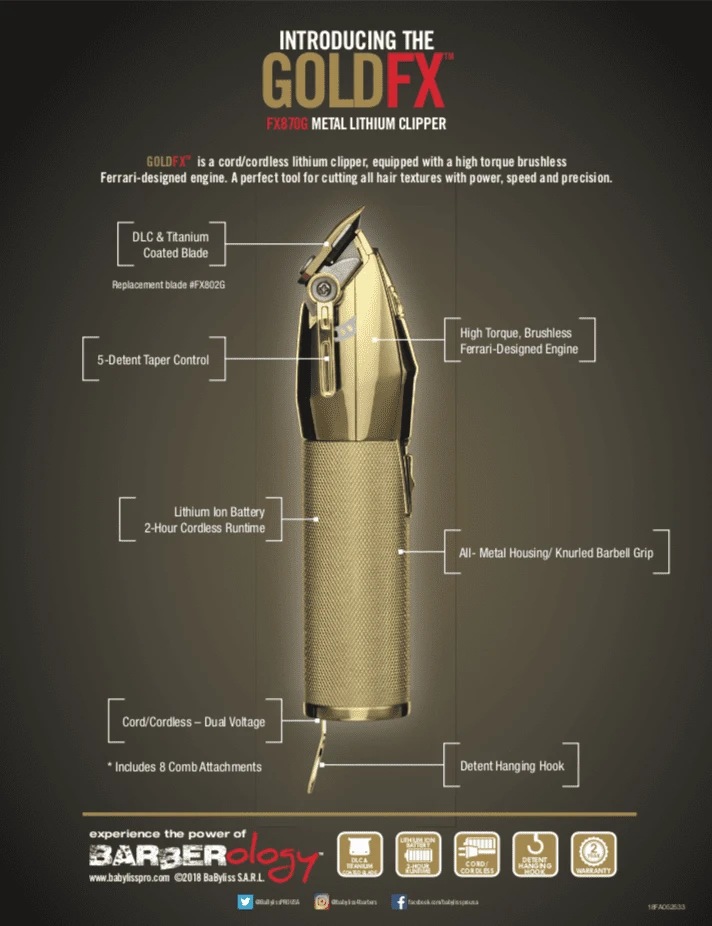 The BaBylissPro GOLDFX is a cord/cordless lithium clipper, equipped with a high-torque, brushless, Ferrari-designed engine. A perfect tool for cutting all hair textures with power, speed and precision.