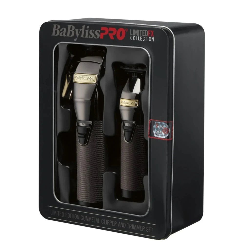 The BabylissPro LimitedFX Gunmetal Clipper and Trimmer Combo #FXHOLPK2GMG comes with the FX870GMG Gunmetal Cordless Clipper and the FX787GMG Gunmetal Skeleton Cordless Trimmer.