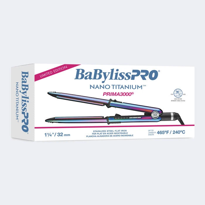 Crafted from the most advanced materials, the BaBylissPRO™ Nano Titanium™ Prima3000™ 1-¼” Ionic Straightener is designed with cutting-edge features that redefine ease of use and excellence of performance. Straighten or curl with smoother, shinier, more beautiful results.