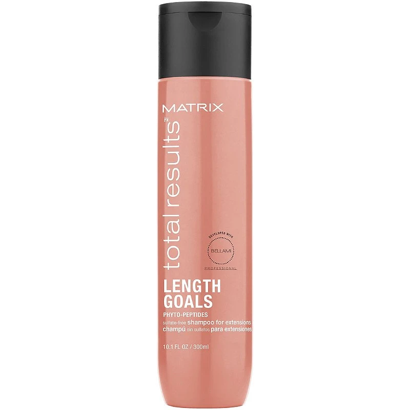 Matrix Total Results Length Goals Shampoo is a sulfate-free shampoo for extensions and wigs. As part of the Length Goals system, it leaves hair 5x easier to detangle, smoother and more conditioned, when used as a system of shampoo, conditioner and leave in. Product fragrance is a sweet blend of watermelon citrus, layered with delicate roses and soft iris.