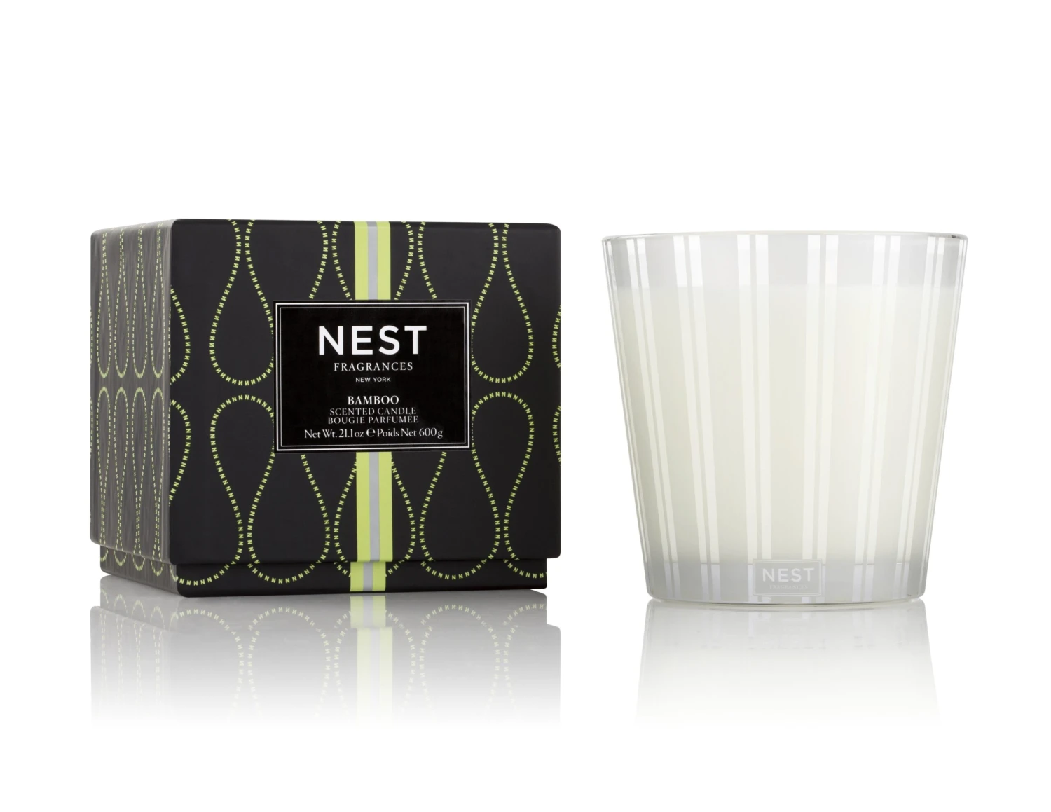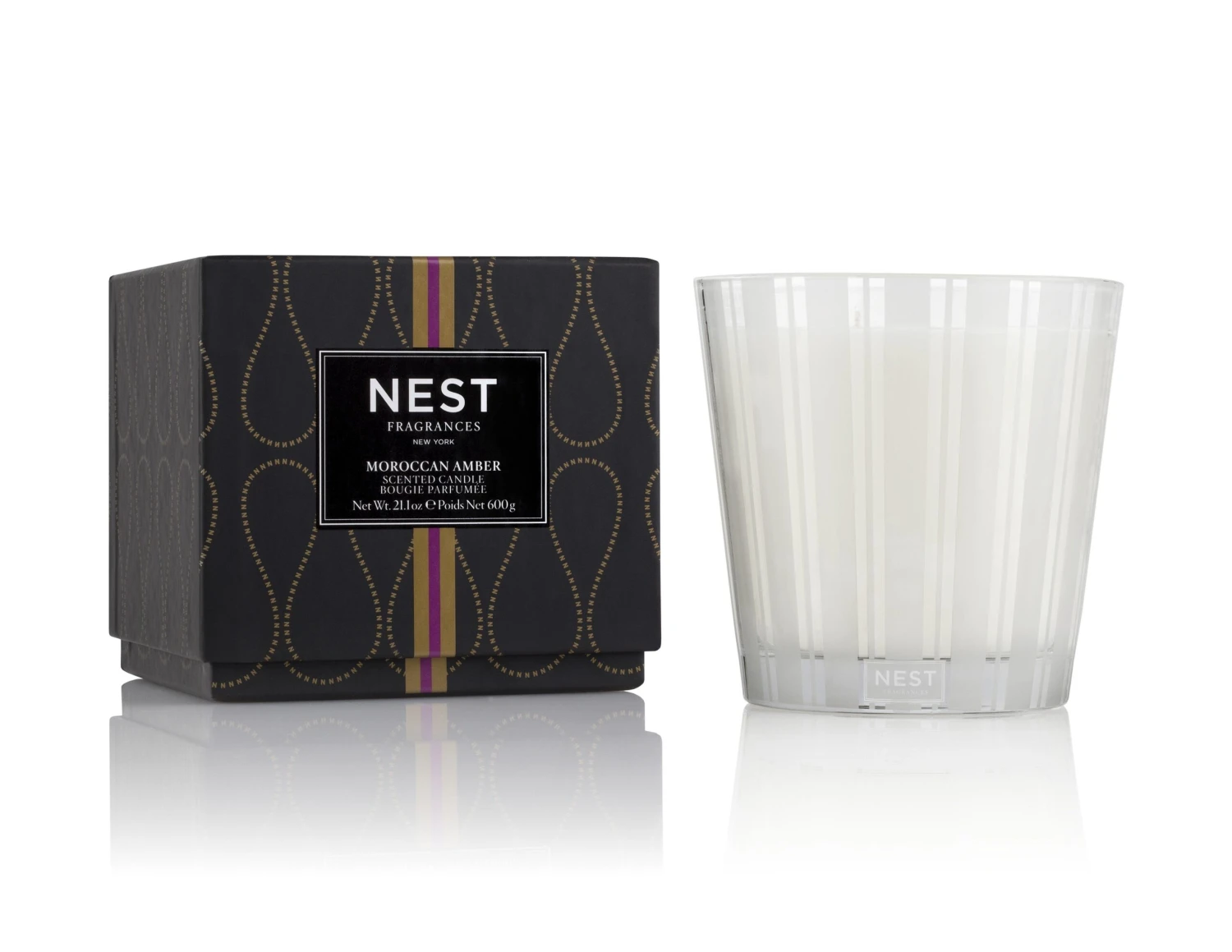Vessel: Housed in a glass vessel etched with elegant, frosted stripes to complement any decor