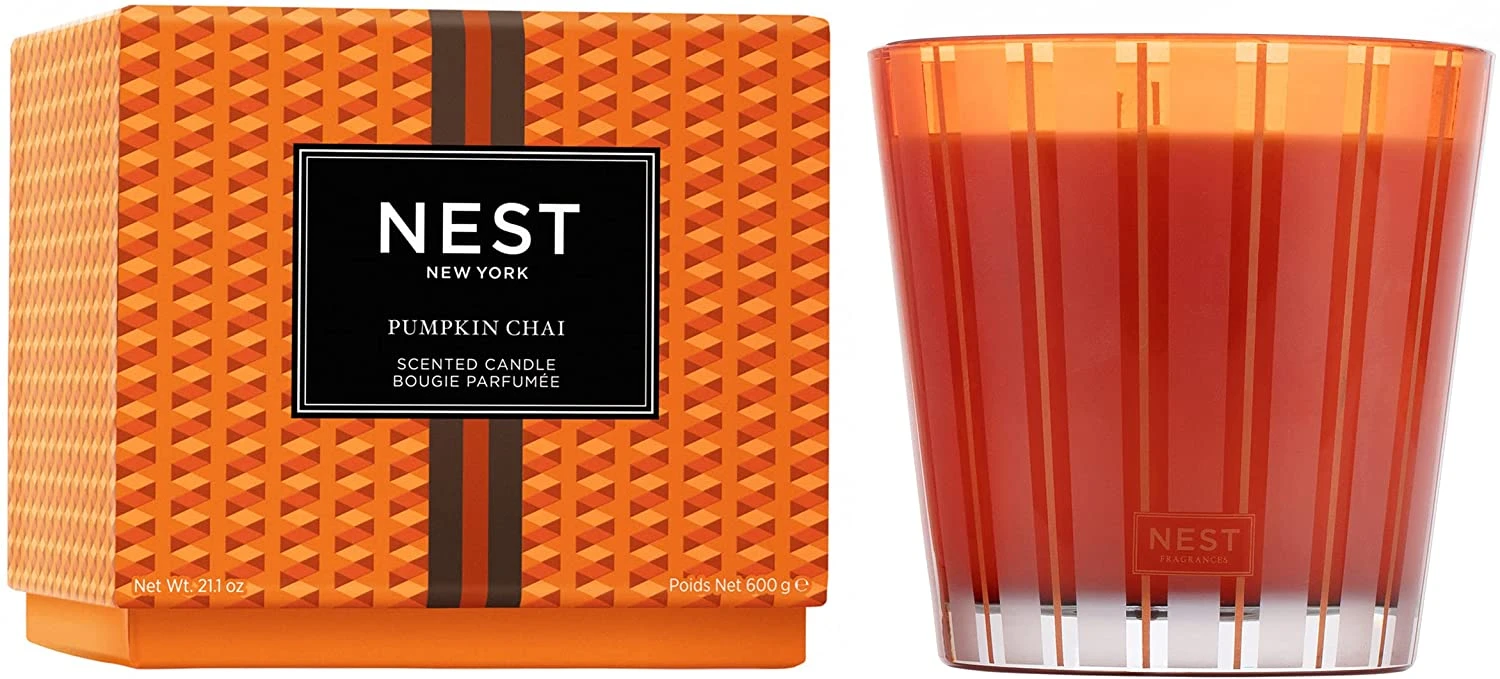 Create a cozy autumn ambiance with this 3-Wick Candle featuring a blend of wild pumpkin, spicy masala chai, cardamom, ginger, and cinnamon.
