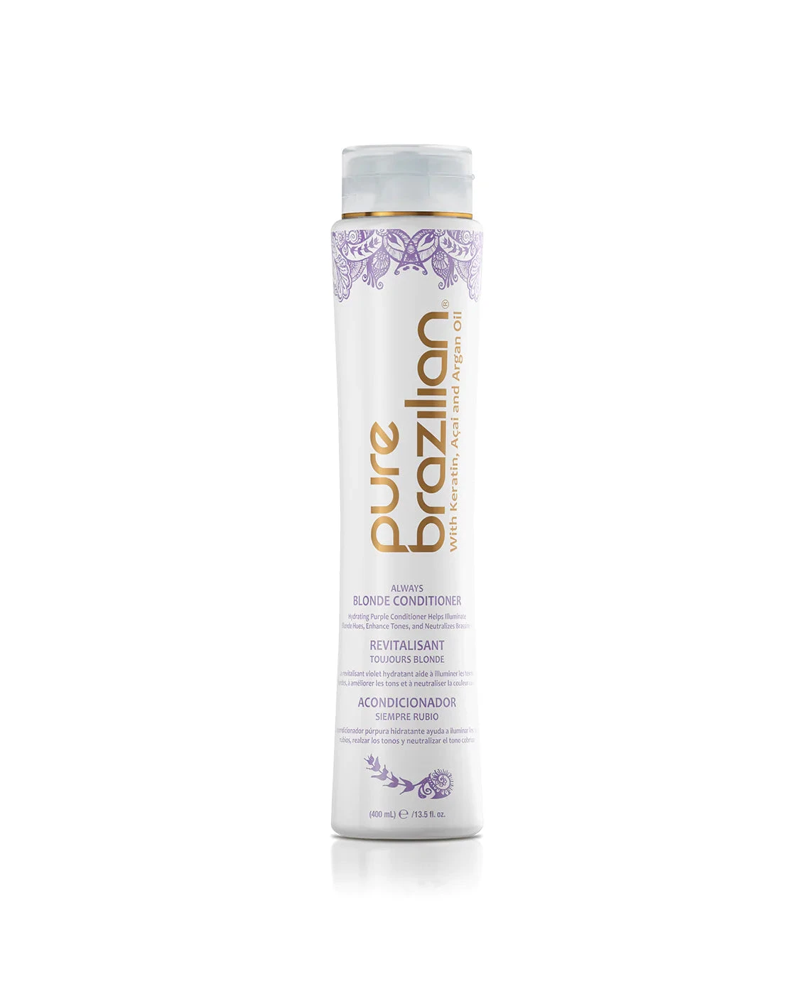 Neutralize your brassy, yellow tones with Pure Brazilian Always Blonde Conditioner. Helps create a luxurious softness and shine while brightening, refreshing, and preserving your blonde, gray, or platinum hair. Gentle enough for daily use.