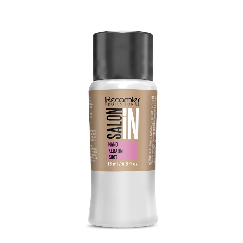 Recamier Salon In Nano Keratin Shot is designed to transform extremely dry and damaged hair by chemical and thermal processes as well as environmental aggressions into a moisturized, soft, silky and shiny hair. Its formula protects and nourishes the capillary fiber. Due to the size of its Keratin Nano Particles, they are able to penetrate through the hair’s fissures sticking to them and therefore restoring from the inside out. By using an iron while applying Salon In Nano Keratin Shot a better alignment of the capillary fibers is produced achieving very shiny hair.