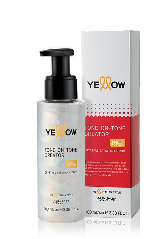 Alfaparf Yellow Tone-on-Tone Creator turns permanent color into demi-permanent color. A smart additive that, when added to Yellow Permanent Color, acts by targeting the alkalinity of the color cream reducing its pH level and transforming it into a true tone-on-tone color. Also carries out a remineralization action.